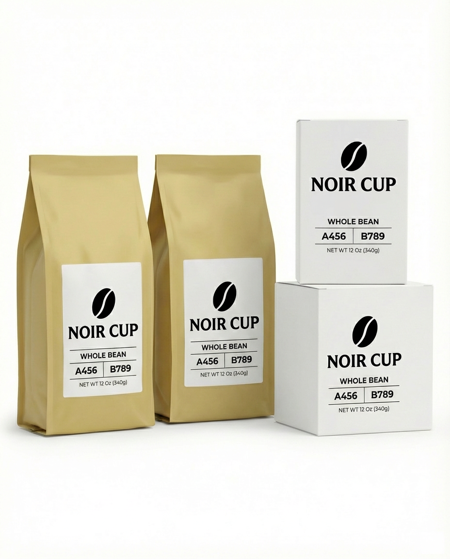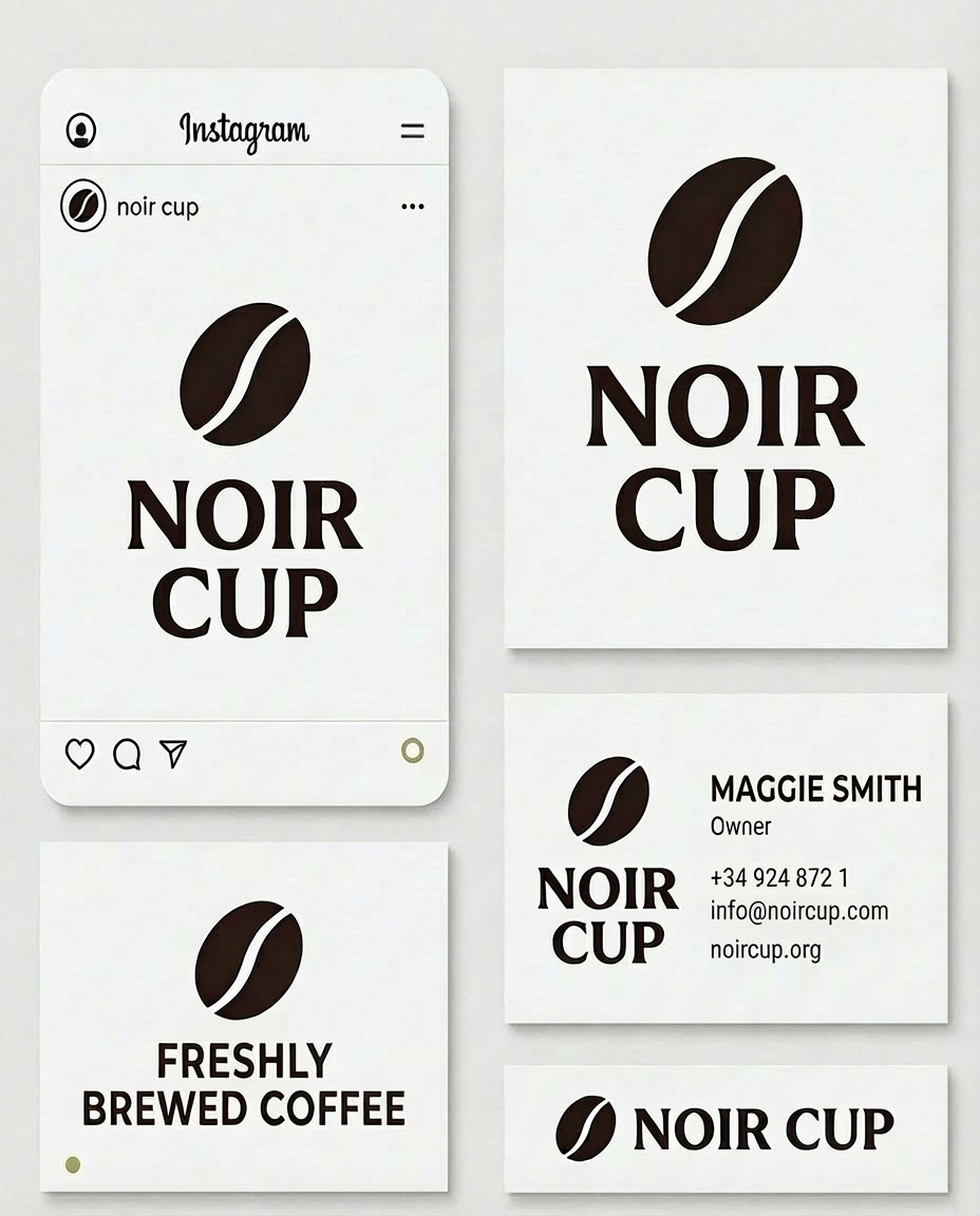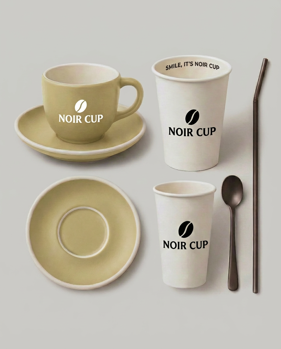 NOIR CUP is a modern, design-led coffeehouse chain built around clarity, calm, and craft. I developed a minimalist visual identity that feels premium yet approachable—anchored by a simple bean mark, confident typography, and a restrained palette of black, white, and warm sand tones. The system was designed to scale across multiple locations and touchpoints, keeping everything consistent from the first glance to the final sip. I applied the identity across packaging (whole-bean bags and boxes), takeaway cups, ceramic mugs, and staff uniforms, creating a cohesive world that’s sleek, contemporary, and instantly recognizable. The result is a brand that feels quiet but bold—clean, stylish, and built for the rhythm of the city.
